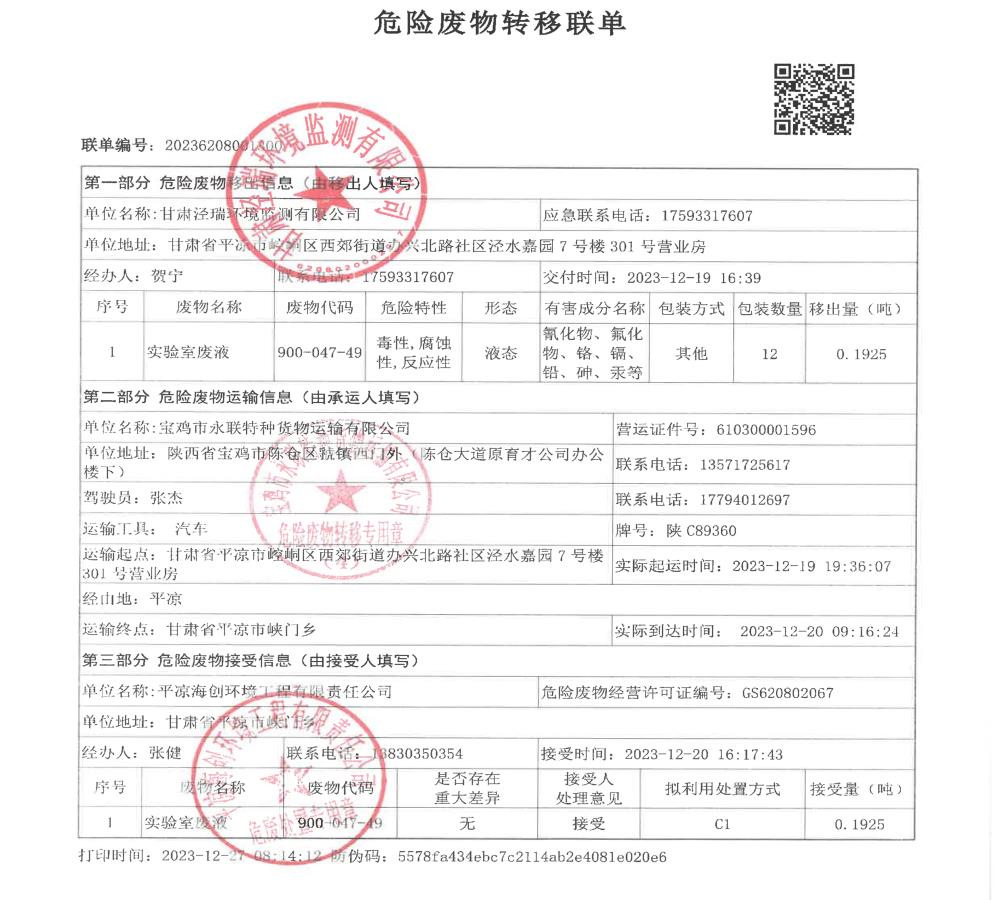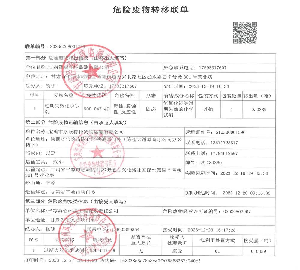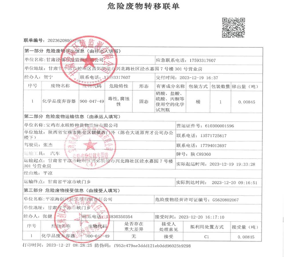 根據《中華人民共和國固體廢物污染環境防治法》(2020年9月1日修訂)的相關規定,甘肅涇瑞環境監測有限公司依法及時公開固體廢物污染環境防治信息,主動接受社會監督。
